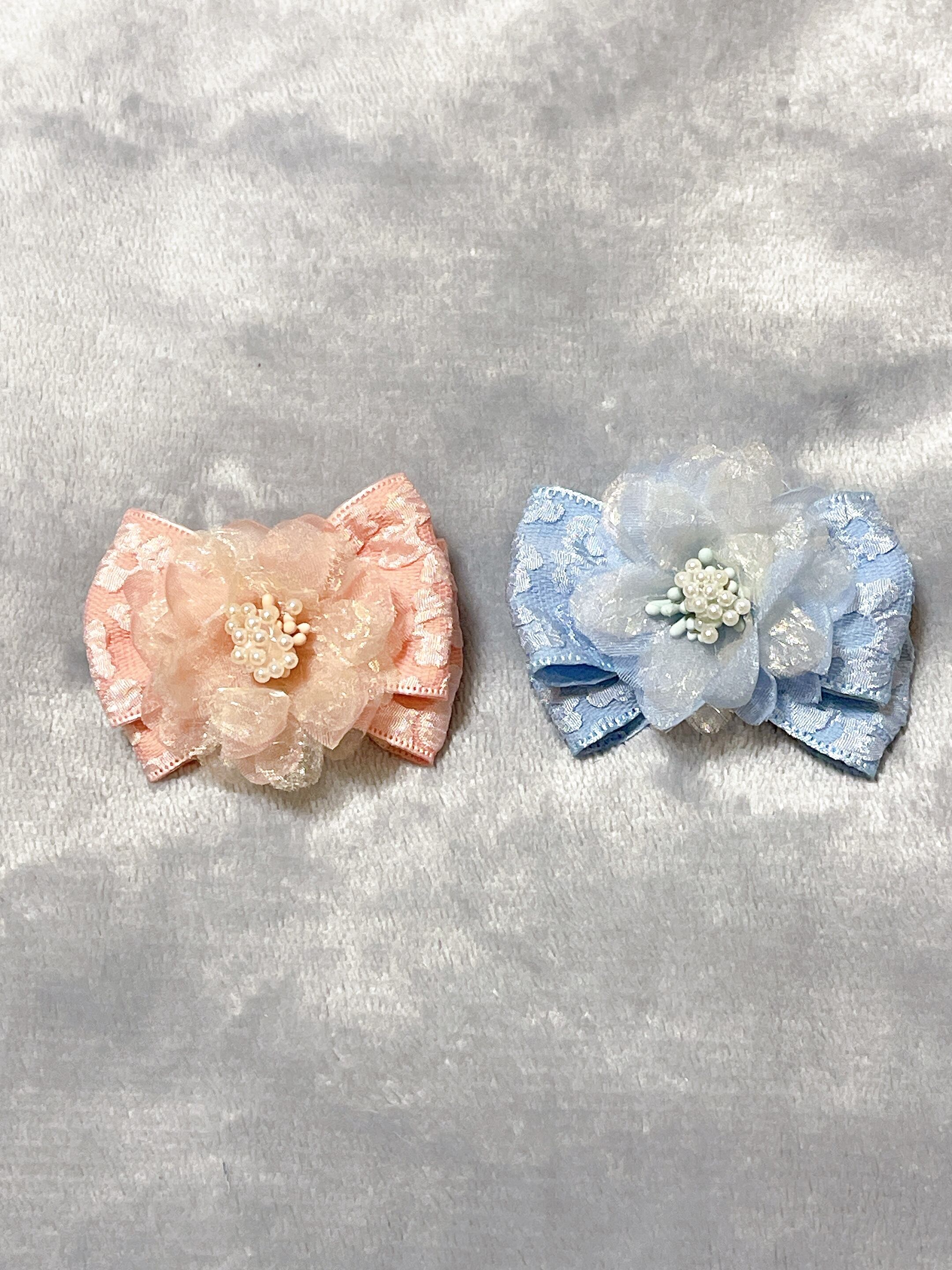 繊細なレースリボンに、シフォン素材のフラワーを重ねたエレガントなデザイン。中心にはパール風ビーズがあしらわれており、上品な華やかさを演出します。おめかしスタイルや記念撮影にもぴったりのアイテムです。